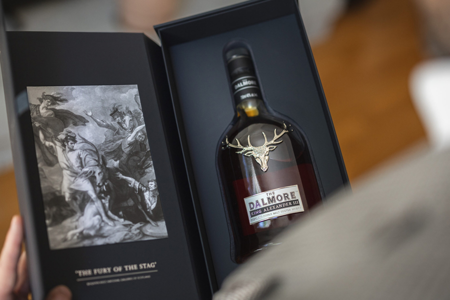展示盒的背面簡要介紹了威士忌的起源故事、Dalmore King Alexander III、威士忌本身以及品酒筆記。在頂部,您會看到被壓印的雄鹿徽章,而在打開的側面,則會看到壓印的 Dalmore 標誌。