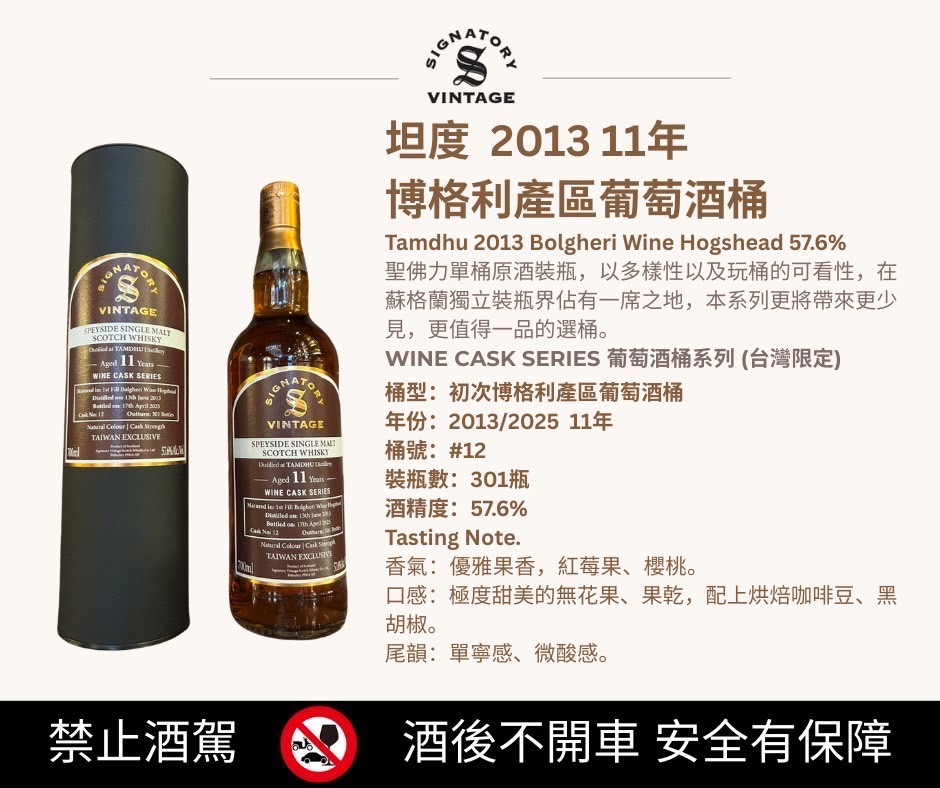 聖弗力 葡萄酒桶系列(台灣限定) 坦度2013/11年柏格利法定葡萄酒桶57.6% #12 Signatory Wine Cask Series Tamdhu 2013/11yo Bolgheri Wine Hogshead 57.6% #12