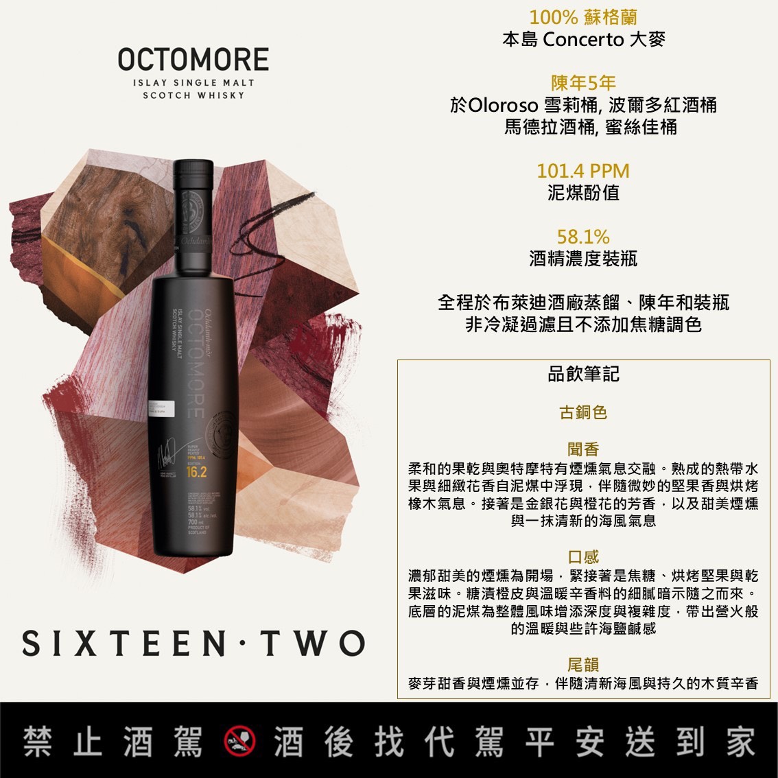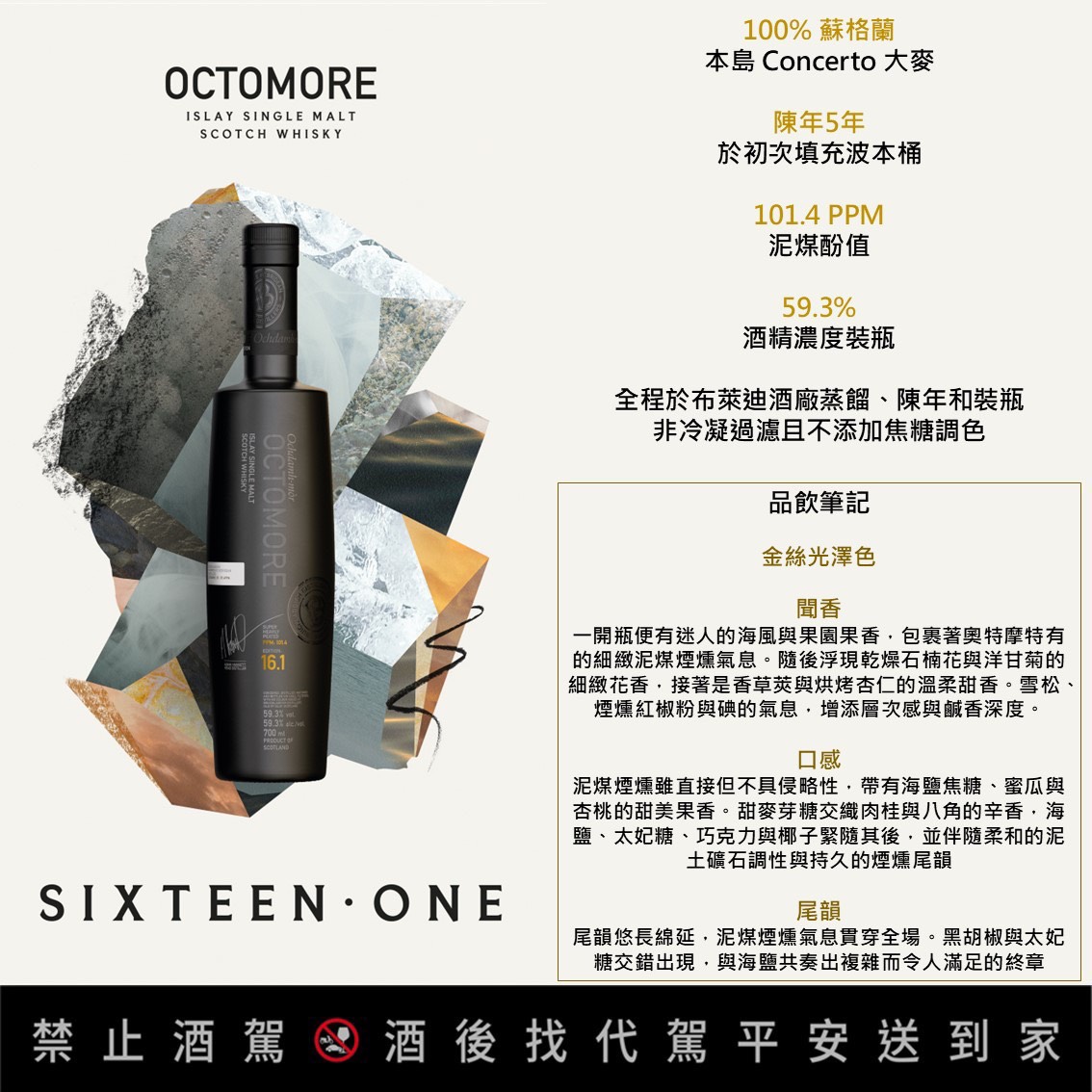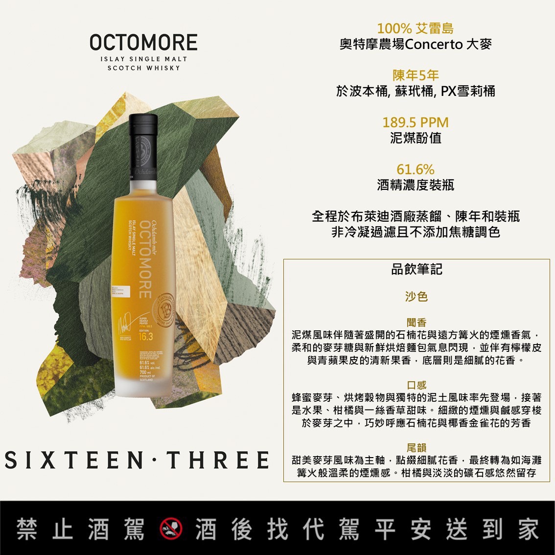 16.3=「風土與泥煤極限」:Islay 本島 Octomore Farm/Church Field 單一田地大麥,桶型為波本+蘇玳(Sauternes)+PX,ABV 61.6%,189.5 PPM。